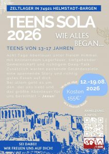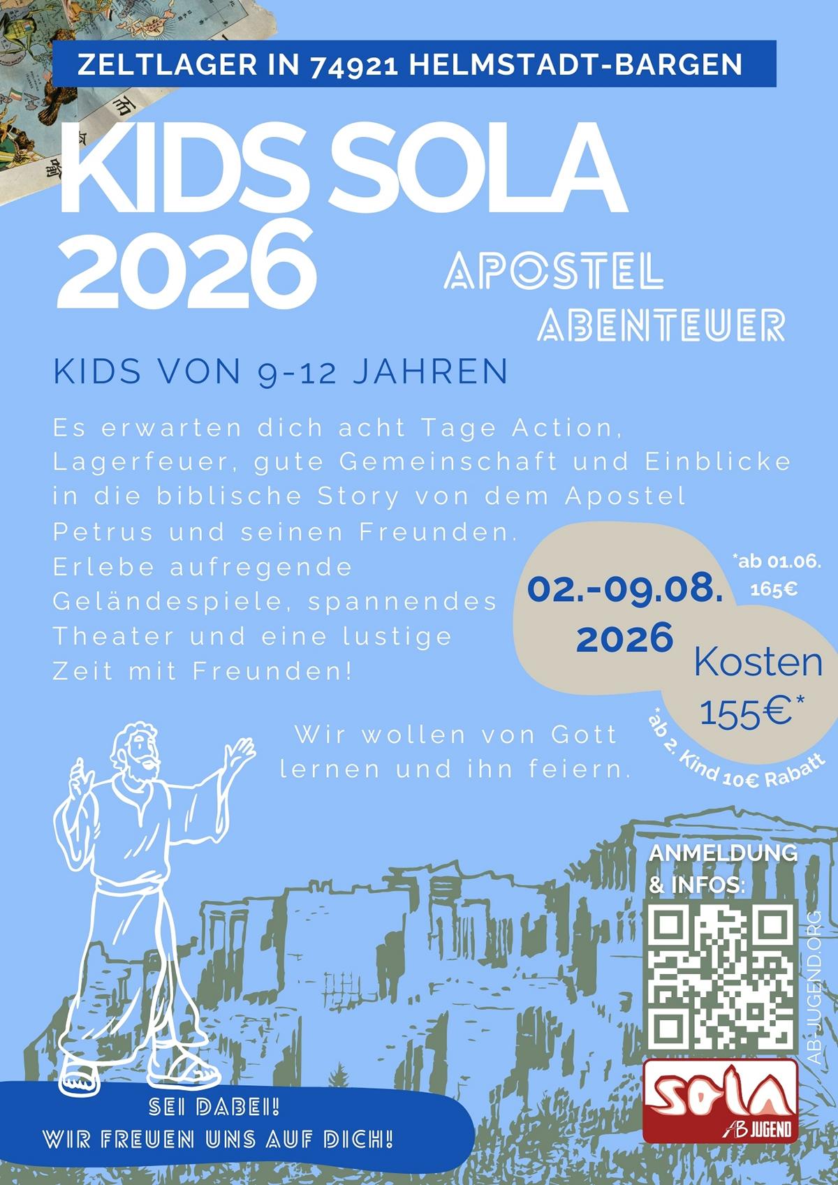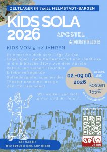 Schnapp dir deinen Schlafsack und deine Abenteuerlust und komm aufs SOLA! Es erwarten dich acht Tage Action mit knisterndem Lagerfeuer, richtig guter Gemeinschaft, einer packenden Story, aufregenden Gelände- spielen, spannendem Theater, lebensnahen Predigten und Gesprächen über den Glauben!